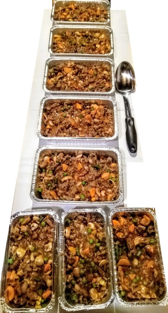 For the storage of the excess, partially cooked ingredients I use aluminium BBQ baking trays of single or double serve sizes. I put it all together, cover it with foil and wrap in plastic wrap before I freeze it.